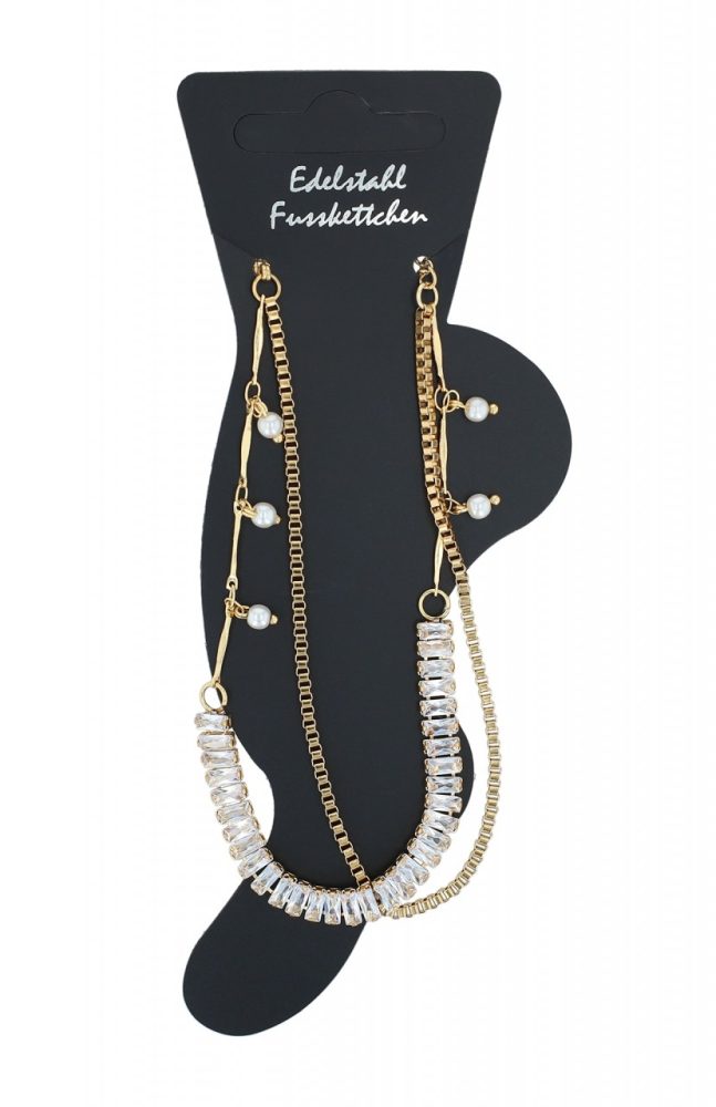 Esta pulseira de pé de duas fileiras combina elementos clássicos com um toque moderno. É feita em aço inoxidável de alta qualidade e acabamento com pérolas artificiais e pedras simili. A pulseira de pé é composta por duas correntes. A primeira corrente é feita em aço inoxidável e oferece uma base resistente e brilhante. A segunda corrente é decorada com pedras simili em forma de baguete dispostas em fileira. É complementado por cinco delicadas pérolas artificiais com diâmetro de 3,5 mm. Medindo 23 cm de comprimento mais uma corrente extensora adicional de 5 cm, esta pulseira de pé oferece um ajuste flexível que pode ser facilmente ajustado para se adequar a diferentes tamanhos. A largura de 7 mm e a espessura de 3 mm garantem uma aparência atraente. Um fecho mosquetão facilita colocar e tirar a pulseira de pé, o que aumenta ainda mais o conforto de uso.