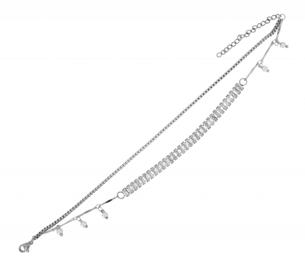 Esta pulseira de pé de duas fileiras combina elementos clássicos com um toque moderno. É feita em aço inoxidável de alta qualidade e acabamento com pérolas artificiais e pedras simili. A pulseira de pé é composta por duas correntes. A primeira corrente é feita em aço inoxidável e oferece uma base resistente e brilhante. A segunda corrente é decorada com pedras simili em forma de baguete dispostas em fileira. É complementado por cinco delicadas pérolas artificiais com diâmetro de 3,5 mm. Medindo 23 cm de comprimento mais uma corrente extensora adicional de 5 cm, esta pulseira de pé oferece um ajuste flexível que pode ser facilmente ajustado para se adequar a diferentes tamanhos. A largura de 7 mm e a espessura de 3 mm garantem uma aparência atraente. Um fecho mosquetão facilita colocar e tirar a pulseira de pé, o que aumenta ainda mais o conforto de uso.