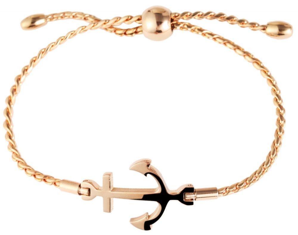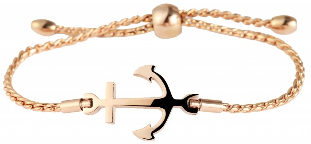 A pulseira de corrente da marca Praktik é feita de aço inoxidável. A textura é de aço inoxidável fosco e brilhante. Tem 22 cm de comprimento. A pulseira simples pode ser aberta e fechada com um fecho de puxar, também feito de aço inoxidável. O que chama a atenção é a âncora no meio da pulseira. O diâmetro da pulseira é de 80 mm. A largura é de 2 mm.