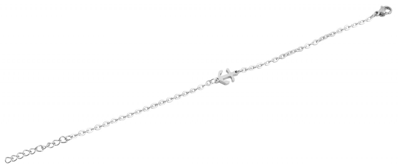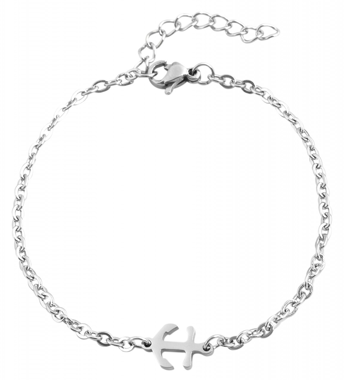 A pulseira de corrente prateada da marca Praktik é feita de aço inoxidável. Tem 17 cm de comprimento e 3 cm de extensão. A pulseira simples pode ser aberta e fechada com um mosquetão prateado, que também é feito de aço inoxidável. O que chama a atenção na pulseira é uma âncora pequena e simples que complementa a pulseira de corrente.