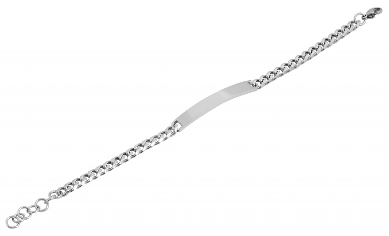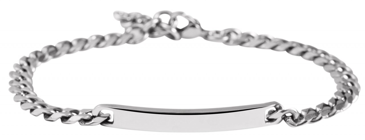 A faixa de identificação prateada da marca Praktik é confeccionada em padrão blindado. Tem 18 cm de comprimento e contém no meio uma placa de gravação com 49 mm de comprimento e 6 mm de largura. Tem uma espessura de 2 mm e pode ser fornecida com vários tipos de gravuras. A pulseira pode ser aberta e fechada com um mosquetão resistente, que também é feito de aço inoxidável. Uma corrente de extensão de 3 cm de comprimento é fixada na extremidade da corrente do meio-fio, o que permite estender o comprimento da pulseira individualmente. As dimensões da banda resultam de uma largura de 6 mm e uma espessura de material de 2 mm. Toda a superfície é polida e confere à joia um visual elegante.
