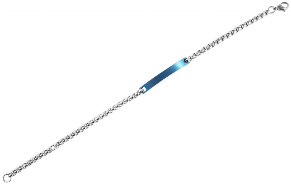 A pulseira veneziana, para todos os tipos de gravuras, da marca Praktik é feita de aço inoxidável e também revestida com IP. Este revestimento contribui para uma melhor resistência a riscos e aparência. A pulseira prateada possui uma placa de identificação azul escura integrada. As dimensões são: comprimento 19 + 4 cm, largura 5 mm e espessura 4 mm.