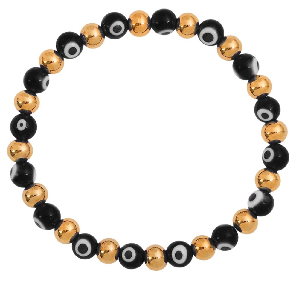 A pulseira da marca Apfel é feita de 16 bolas de aço inoxidável e 16 bolas de plástico uniformemente espaçadas. As bolas de plástico são decoradas com o olho de Nazar, por isso esta pulseira de joalheria não é apenas uma companheira da moda, mas também um talismã que oferece proteção ao usuário todos os dias. As bolas são montadas em um elástico de borracha de náilon. Isso significa que a joia pode ser facilmente puxada pelo pulso. As dimensões da pulseira resultam de um diâmetro interno de aprox. 5 cm quando relaxada e uma espessura de 0,6 cm. A pulseira também é perfeita como presente, por exemplo, para um aniversário, Dia dos Namorados ou Natal.