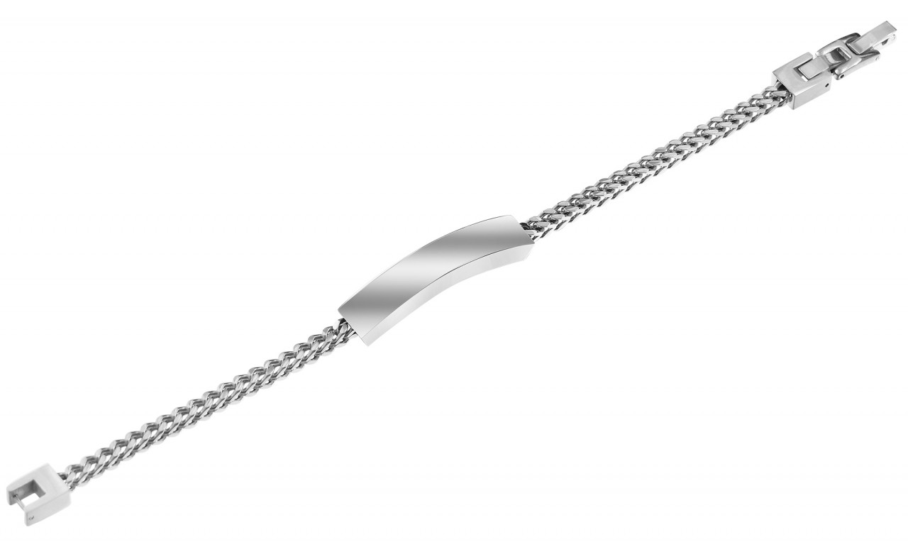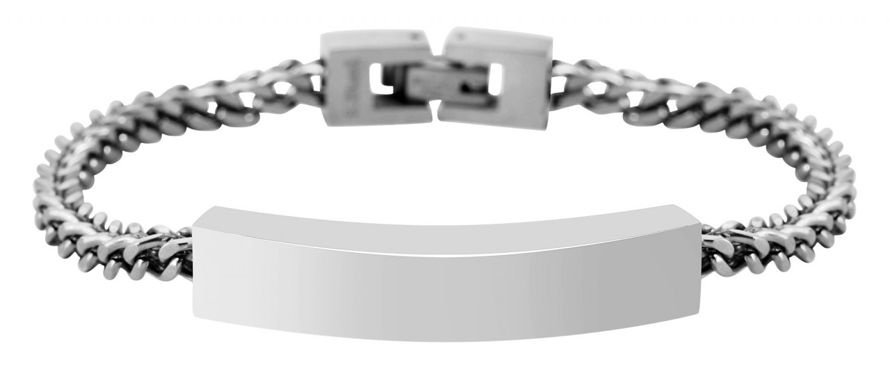 A pulseira no padrão corrente Franco é feita de aço inoxidável e tem 20 cm de comprimento. Além disso, um elemento adicional de 1,5 cm de comprimento permite variar o comprimento. O material é robusto, agradável à pele e promete uma longa vida útil. A disposição plana da estrutura da corrente torna-a confortável de usar. A disposição dos elementos, como a espessura de 4 mm, confere à pulseira o seu aspecto masculino e magnífico, pois é constituída por uma série de elementos em forma de V intimamente ligados que garantem um elevado nível de conforto e tornam o look tão sólido. No centro encontra-se uma placa de gravação brilhante com 43 mm de comprimento e 8 mm de largura, que pode ser dotada de qualquer tipo de gravação e transformada numa joia muito individual.