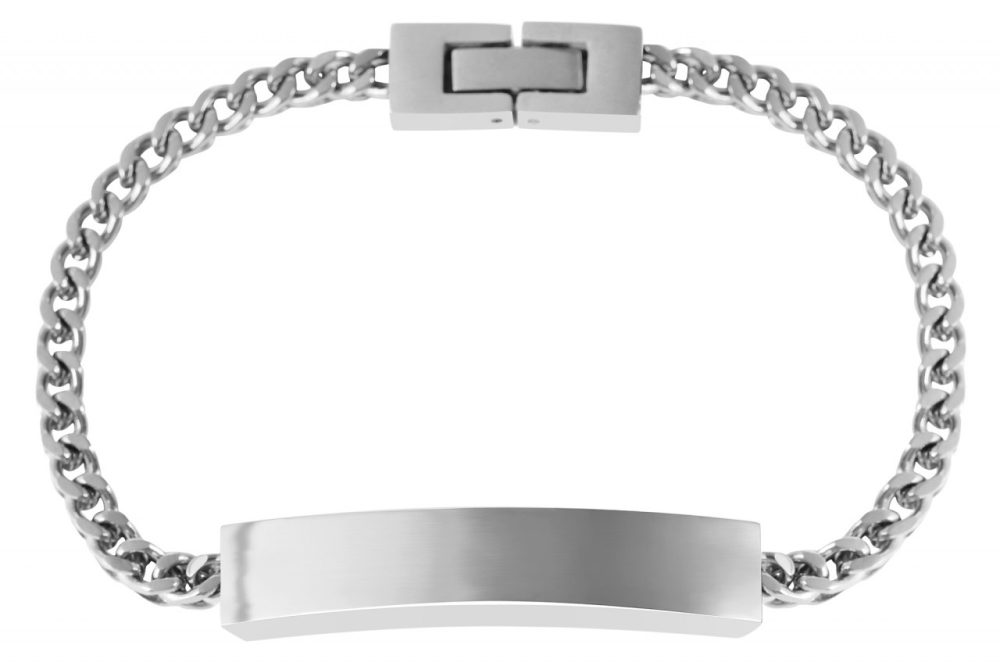A pulseira no padrão corrente Franco é feita de aço inoxidável e tem 20 cm de comprimento. Além disso, um elemento adicional de 1,5 cm de comprimento permite variar o comprimento. O material é robusto, agradável à pele e promete uma longa vida útil. A disposição plana da estrutura da corrente torna-a confortável de usar. A disposição dos elementos, como a espessura de 4 mm, confere à pulseira o seu aspecto masculino e magnífico, pois é constituída por uma série de elementos em forma de V intimamente ligados que garantem um elevado nível de conforto e tornam o look tão sólido. No centro encontra-se uma placa de gravação brilhante com 43 mm de comprimento e 8 mm de largura, que pode ser dotada de qualquer tipo de gravação e transformada numa joia muito individual.