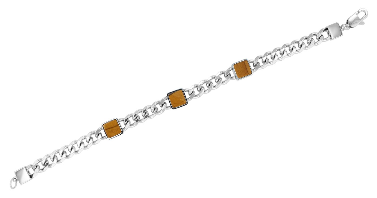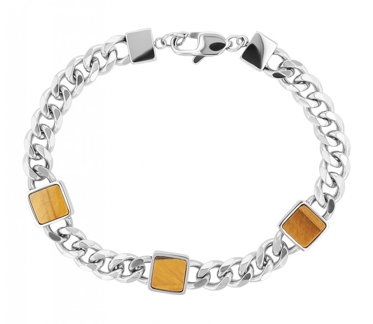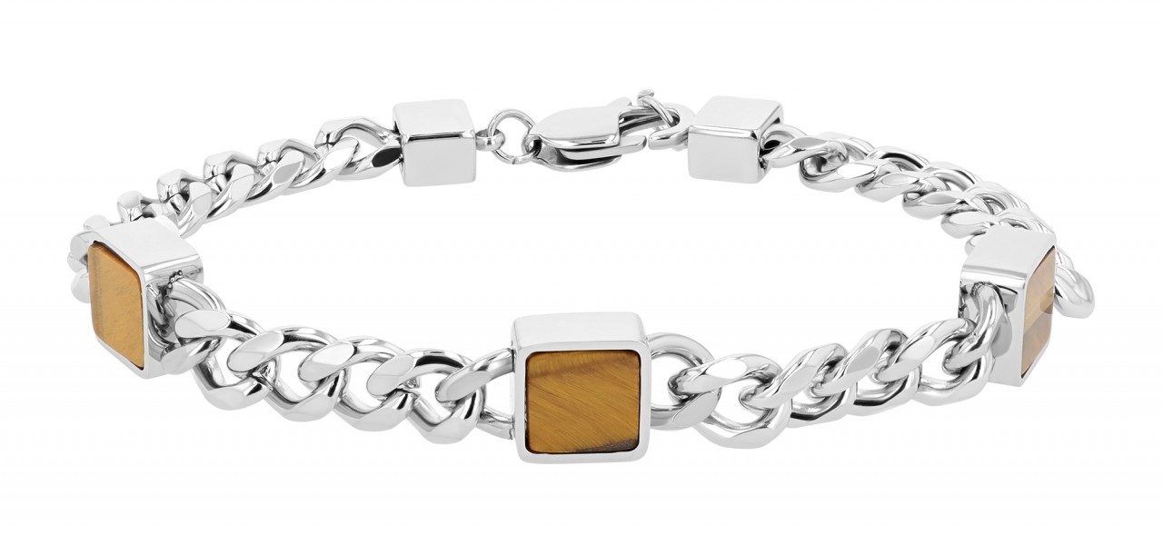 Descubra a nossa pulseira em aço inoxidável, refinada com elementos sensuais de ágata marrom. Esta pulseira incorpora beleza, força e estilo em um só lugar. Com comprimento total de 21,5 cm, esta pulseira não é apenas uma joia, mas uma afirmação. A largura de 7 mm e a espessura de 3 mm conferem-lhe robustez e elegância ao mesmo tempo. O fecho lagosta garante uma fixação segura, para que possa ser usado despreocupadamente, sem ter que se preocupar em abri-lo sozinho. A magia desta pulseira é revelada no meio, onde três impressionantes elementos de ágata marrom de 9 x 9 mm adornam a pulseira. Cada elemento é único, pois os grãos e as nuances de cor da ágata variam naturalmente. O material de aço inoxidável com o qual esta obra-prima é feita é da mais alta qualidade e durabilidade.