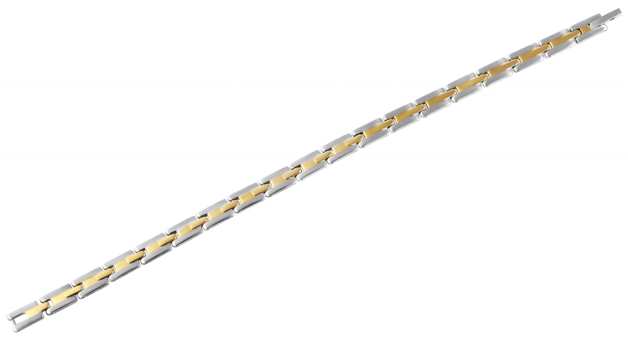 A pulseira de elos da marca Praktik é feita de aço inoxidável. Simplesmente removendo os elementos, a pulseira pode ser encurtada conforme desejado. Pode ser aberto e fechado com fecho de clipe de aço inoxidável. As dimensões do item são: comprimento 20 mm, largura 6 mm e espessura 2 mm.