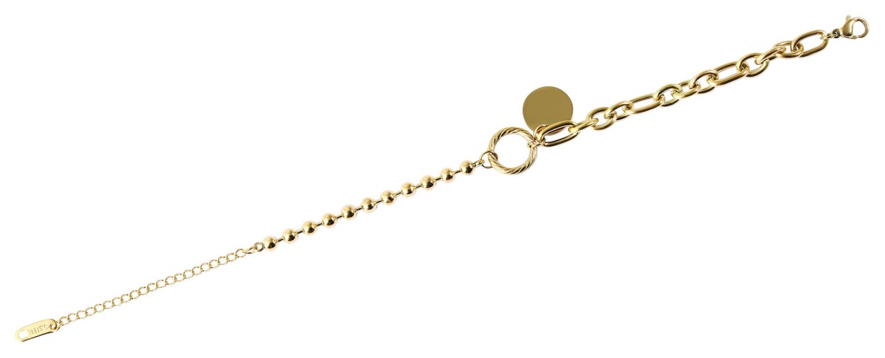 A sofisticada pulseira de joias da marca Praktik é feita de aço inoxidável. Tem 17 cm de comprimento e pode ser ampliado individualmente em 3 cm graças a uma corrente extensora. A pulseira consiste em diferentes tipos de correntes. A combinação de uma corrente de bola e uma corrente de âncora Figaro torna a pulseira um verdadeiro atrativo que rapidamente se tornará uma parte indispensável do seu pulso. Os diferentes fios da corrente são mantidos juntos por um pingente redondo no meio, ao qual é fixada uma moeda gravada. A moeda oferece espaço suficiente para ser desenhada individualmente com diversas gravuras de qualquer tipo. Isto significa que a pulseira moderna rapidamente se torna um presente lindo e personalizado, por exemplo, para um aniversário, Dia dos Namorados ou aniversário de casamento. Pode ser aberto e fechado com fecho lagosta de aço inoxidável.