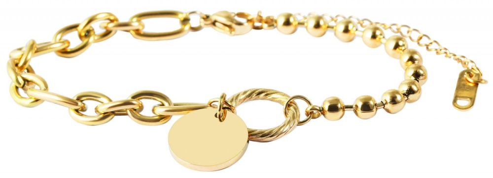 A sofisticada pulseira de joias da marca Praktik é feita de aço inoxidável. Tem 17 cm de comprimento e pode ser ampliado individualmente em 3 cm graças a uma corrente extensora. A pulseira consiste em diferentes tipos de correntes. A combinação de uma corrente de bola e uma corrente de âncora Figaro torna a pulseira um verdadeiro atrativo que rapidamente se tornará uma parte indispensável do seu pulso. Os diferentes fios da corrente são mantidos juntos por um pingente redondo no meio, ao qual é fixada uma moeda gravada. A moeda oferece espaço suficiente para ser desenhada individualmente com diversas gravuras de qualquer tipo. Isto significa que a pulseira moderna rapidamente se torna um presente lindo e personalizado, por exemplo, para um aniversário, Dia dos Namorados ou aniversário de casamento. Pode ser aberto e fechado com fecho lagosta de aço inoxidável.