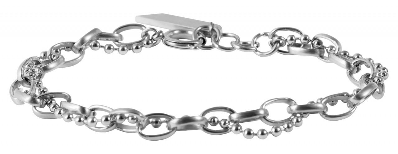 A pulseira de jóias Akzent é feita de aço inoxidável e está disponível em diferentes cores. A peça de joalharia moderna impressiona pelo seu design sofisticado, uma vez que é feita de dois tipos diferentes de corrente. A corrente marcante é feita num padrão de âncora, com uma corrente de bola que envolve elegantemente a pulseira de âncora e completa habilmente o visual moderno. Outra caraterística especial é o pendente em aço inoxidável com 18,5 mm de comprimento e 4 mm de largura no final da pulseira, que pode ser personalizado com gravações em filigrana para tornar esta pulseira num acessório muito pessoal. O comprimento total é de 17 cm, a largura é de 6 mm e a espessura do material é de 2 mm. A pulseira abre-se e fecha-se com um mosquetão redondo clássico, também em aço inoxidável.