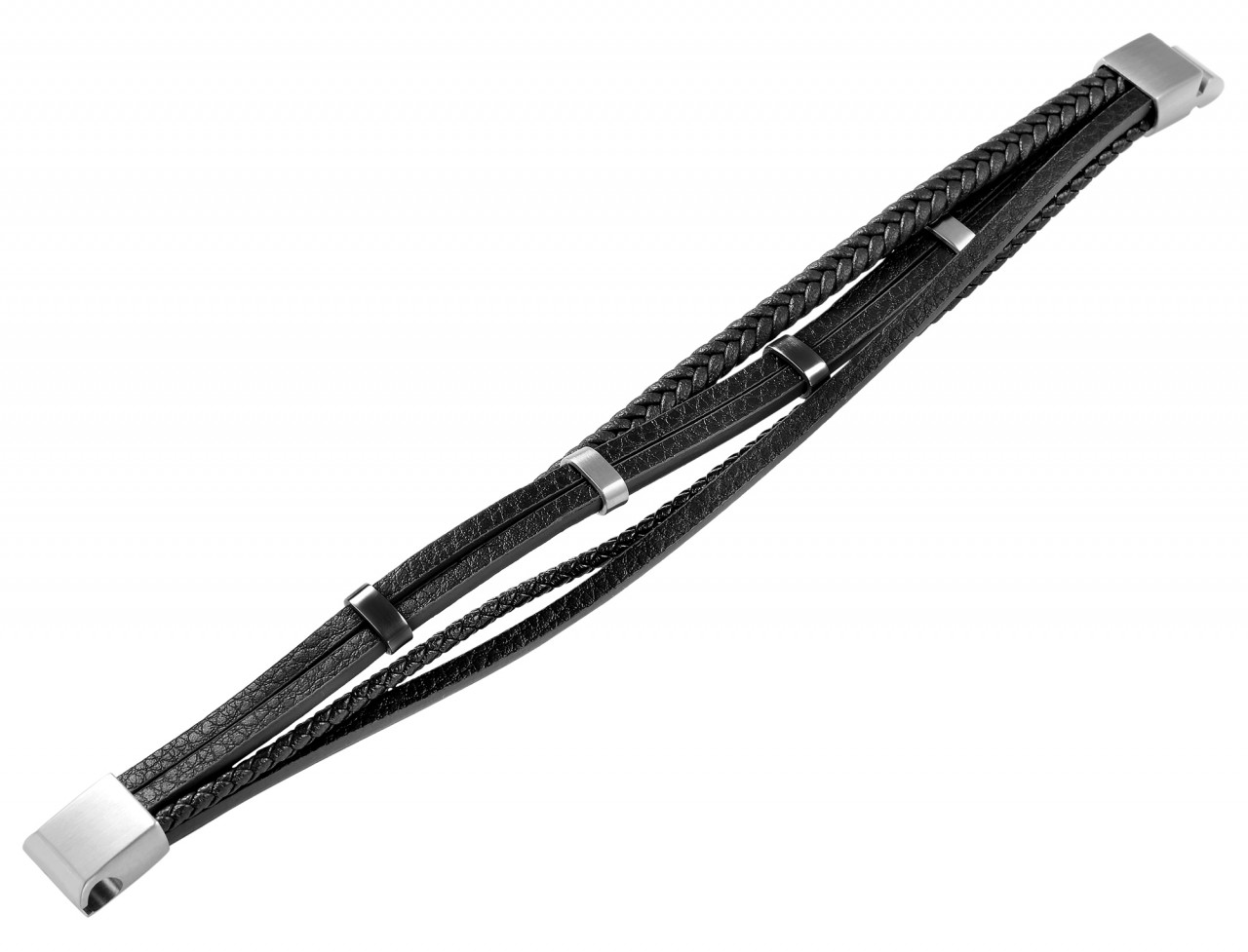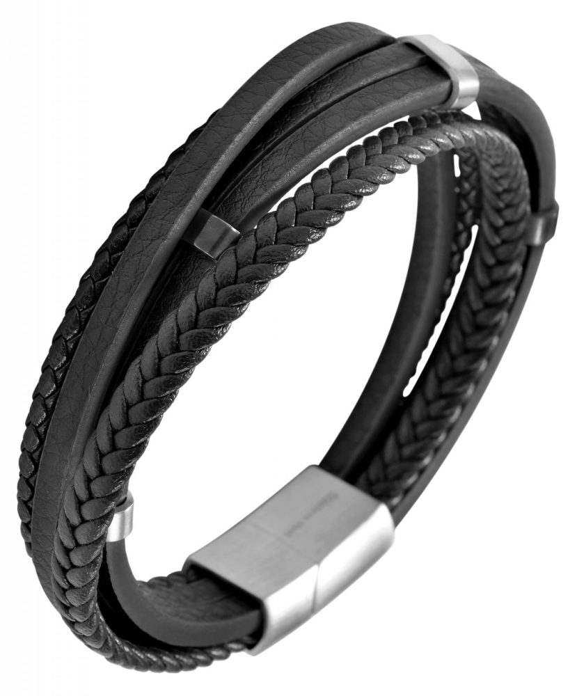 A pulseira preta da marca Praktik é feita em imitação de couro e está disponível nos comprimentos de 19 cm, 21 cm e 23 cm. A pulseira de joias de cinco fileiras consiste em três tiras de couro sintético, uma tira trançada e um cordão trançado. Duas pulseiras são conectadas com elementos de aço inoxidável prateado e preto, que completam habilmente o design. Com fecho magnético prático e sólido, pode ser aberto e fechado com facilidade e também pode ser personalizado com pequenas gravuras. A combinação de diferentes materiais torna esta pulseira especial e fica bem em pulsos femininos e masculinos. Com este produto você obtém o acessório perfeito para presentear seus entes queridos com uma joia original ou para se presentear.