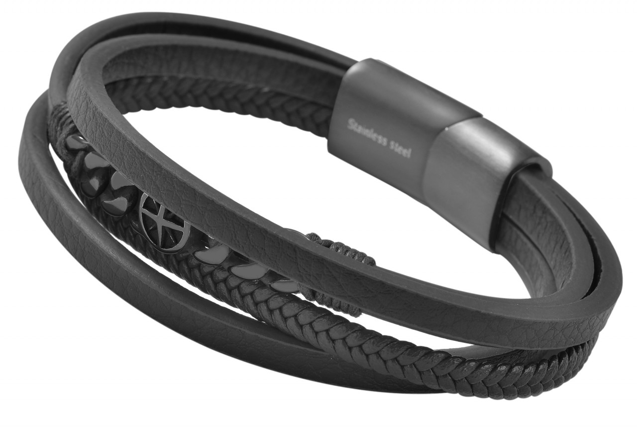 Das schwarze Armband der Marke Akzent wurde aus Lederimitation gefertigt und ist in den Längen 19 cm, 21 cm und 23 cm erhältlich. Das vierreihige Schmuckarmband besteht aus drei Kunstlederriemen und einem geflochtenen Band. Mittig präsentiert sich ein 41 x 8 mm großes Edelstahlelement in Kettenstruktur, welches sich optisch gekonnt hervorhebt und das Design gelungen vollendet. Mit einem praktischen und massiven Magnetverschluss lässt es sich leichthändig öffnen und schließen und zudem mit kleinen Gravuren individuell gestalten. Die mattierte Schließe ist aus Edelstahl gefertigt und mit einer hochwertigen Ionenplattierung veredelt. Die Kombination aus verschiedenen Materialien lassen dieses Armband besonders wirken und es macht sowohl an weiblichen, als auch an männlichen Handgelenken eine gute Figur. Mit diesem Produkt erhalten Sie das perfekte Accessoire, um Ihren Liebsten ein origin…