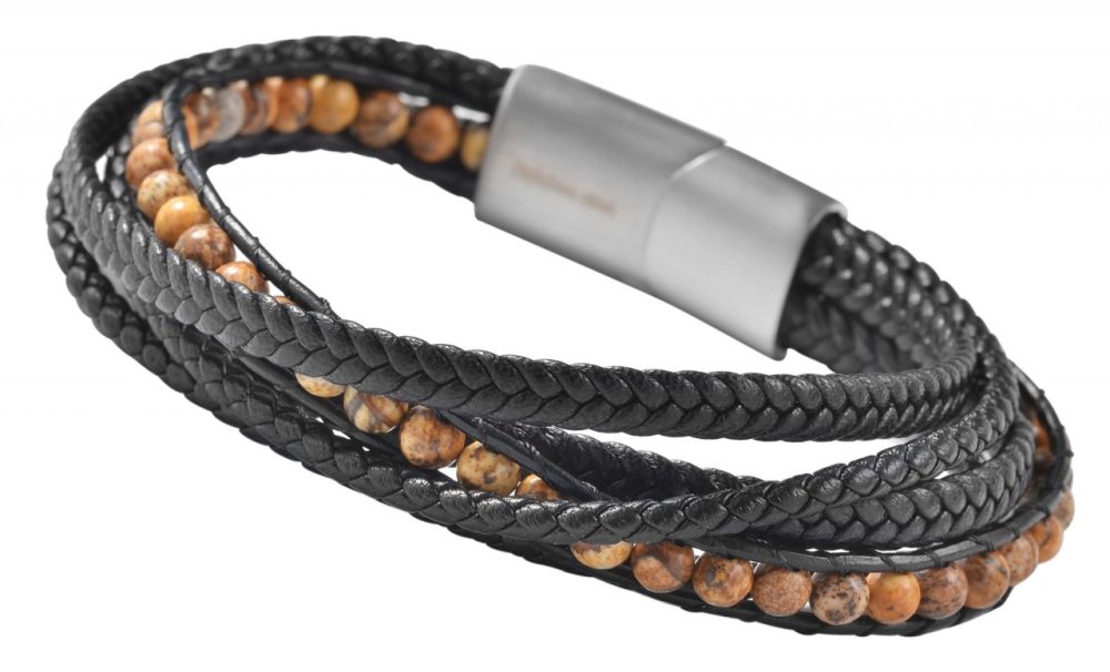 A pulseira preta da marca Praktik é feita de imitação de couro e bolas de pedra natural e está disponível nos comprimentos de 19 cm, 21 cm e 23 cm. A pulseira de cinco fileiras consiste em duas tiras e cordões de couro sintético trançado e um fio de contas feito de pedras preciosas de jaspe. Devido à natureza natural do quartzo mineral, cada conta é única e, portanto, possui efeitos de cores diferentes. Com um fecho magnético prático e sólido, a pulseira pode ser aberta e fechada com facilidade e também pode ser desenhada individualmente com pequenas gravuras. Com esta pulseira você obtém o acessório perfeito para completar o seu look, que é particularmente amigo da pele devido às matérias-primas naturais e de alta qualidade.