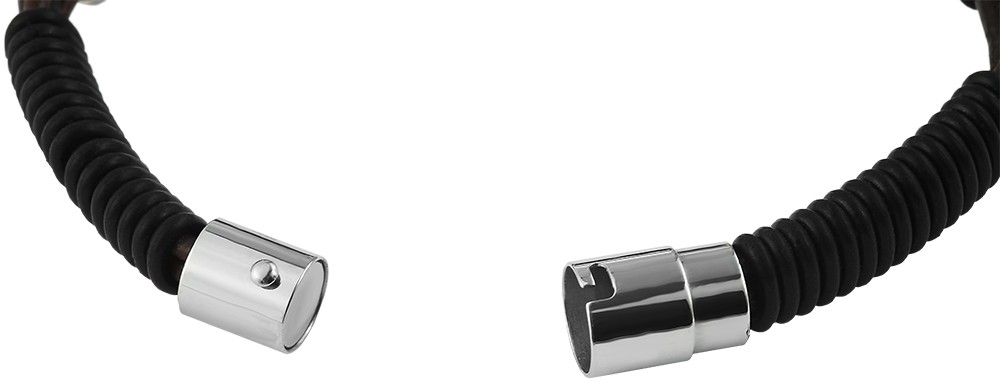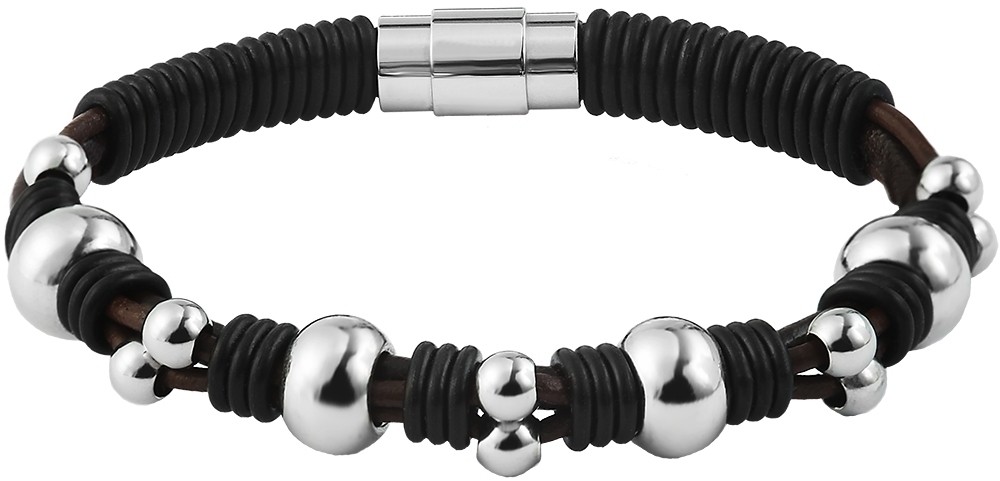 A pulseira de imitação de couro da marca Praktik é feita de várias tiras de couro sintético e é adicionalmente decorada com elementos esféricos de aço inoxidável. A divertida pulseira de joias pode ser aberta e fechada com um prático fecho magnético prateado. As dimensões resultam de um comprimento total de 23 cm e espessura de 1 cm.