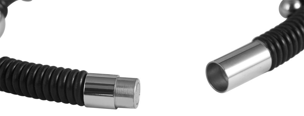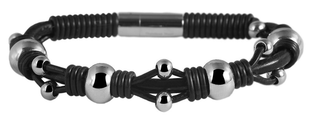 A pulseira de imitação de couro da marca Praktik é feita de uma pulseira de couro sintético envolvida por uma pulseira estreita em diferentes padrões e também decorada com elementos esféricos de aço inoxidável. A moderna pulseira de joias pode ser aberta e fechada com um fecho magnético prateado. As dimensões resultam de um comprimento total de 21 cm e uma espessura de 8 mm.