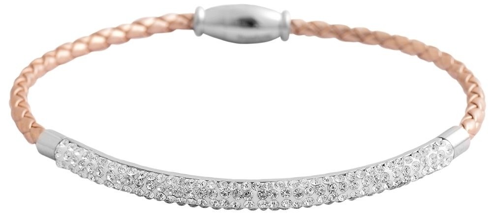 A pulseira feminina da marca Praktik é feita de imitação de couro trançado e adornada com um elemento de aço inoxidável no meio, que é colocado uniformemente em quatro fileiras com um total de 152 pedras simili. A pulseira pode ser aberta e fechada através de um prático fecho magnético de aço inoxidável. As pedras simil brilhantes tornam a pulseira um verdadeiro atrativo e o material macio garante que seja confortável de usar. A pulseira tem comprimento total de 19 cm, largura de 4 mm e espessura de 3 mm.