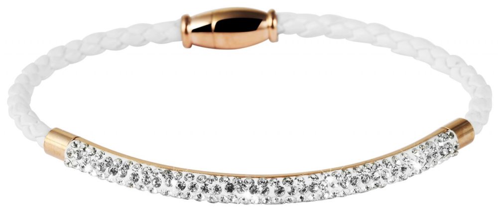 A pulseira feminina da marca Praktik é feita de imitação de couro trançado e adornada com um elemento de aço inoxidável no meio, que é colocado uniformemente em quatro fileiras com um total de 152 pedras simili. A pulseira pode ser aberta e fechada através de um prático fecho magnético de aço inoxidável. As pedras simil brilhantes tornam a pulseira um verdadeiro atrativo e o material macio garante que seja confortável de usar. A pulseira tem comprimento total de 19 cm, largura de 4 mm e espessura de 3 mm.