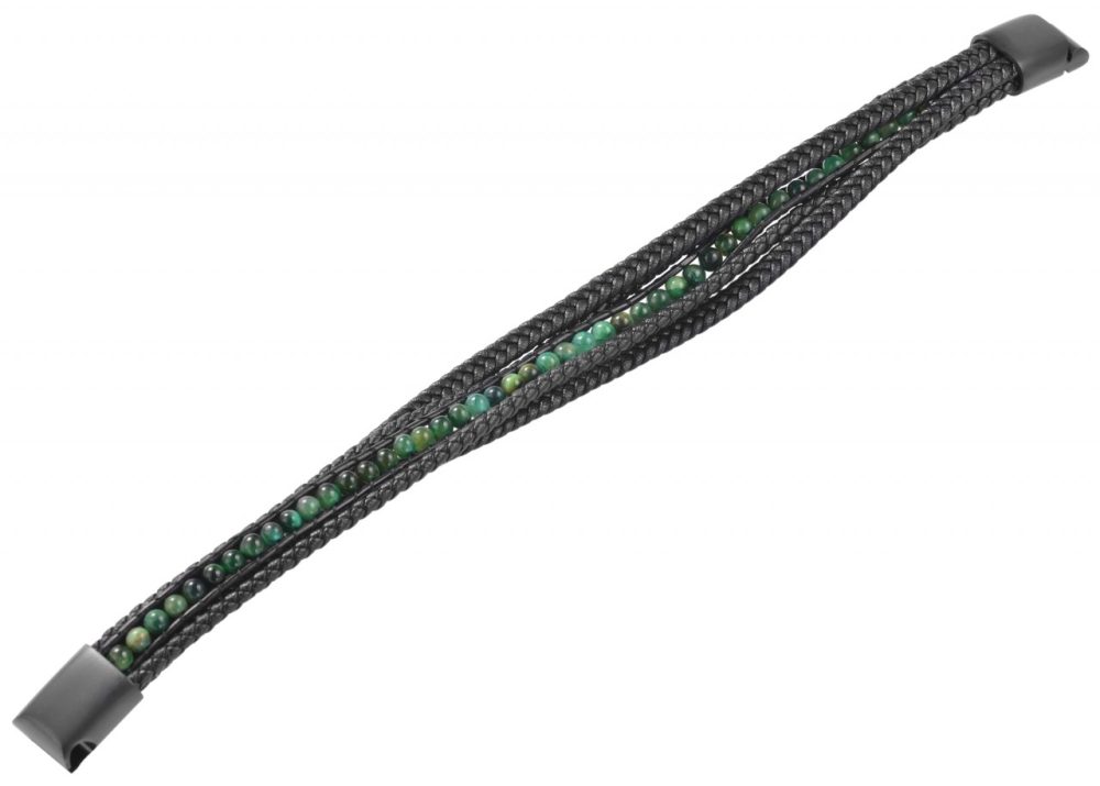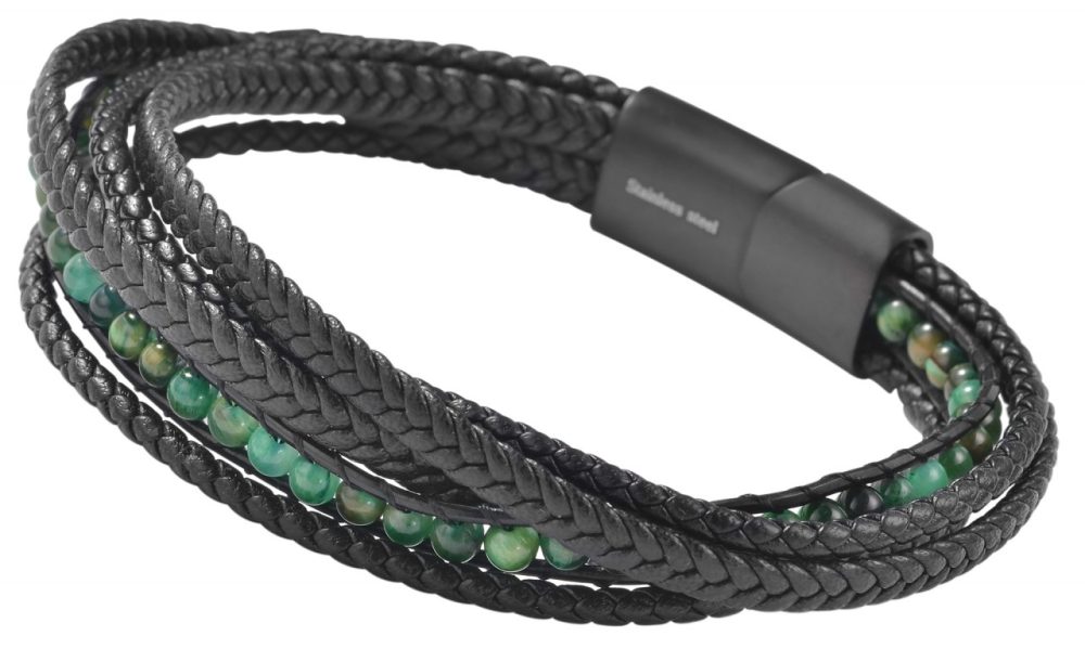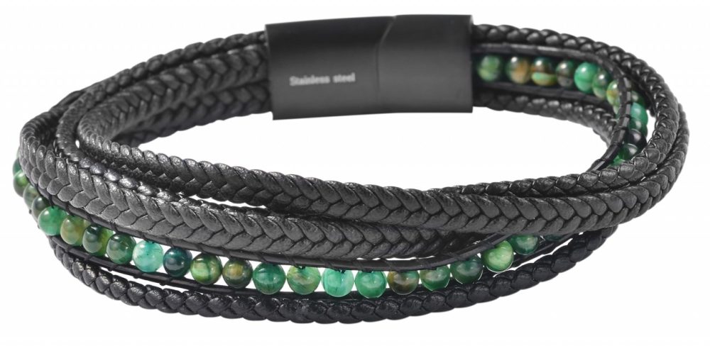 A pulseira preta da marca Praktik é feita de imitação de couro e bolas de pedra natural e está disponível nos comprimentos de 19 cm, 21 cm e 23 cm. A pulseira de joias de cinco fileiras consiste em duas tiras e cordões de couro sintético trançado e um fio de contas verdes de olho de tigre. Devido à natureza natural do quartzo mineral, cada conta é única e, portanto, possui efeitos de cores diferentes. Com fecho magnético prático e sólido, pode ser aberto e fechado com facilidade e também pode ser personalizado com pequenas gravuras. O fecho fosco é feito de aço inoxidável e com acabamento em revestimento iônico de alta qualidade. Com este produto você obtém o acessório perfeito para presentear seus entes queridos com uma joia original ou para se presentear.