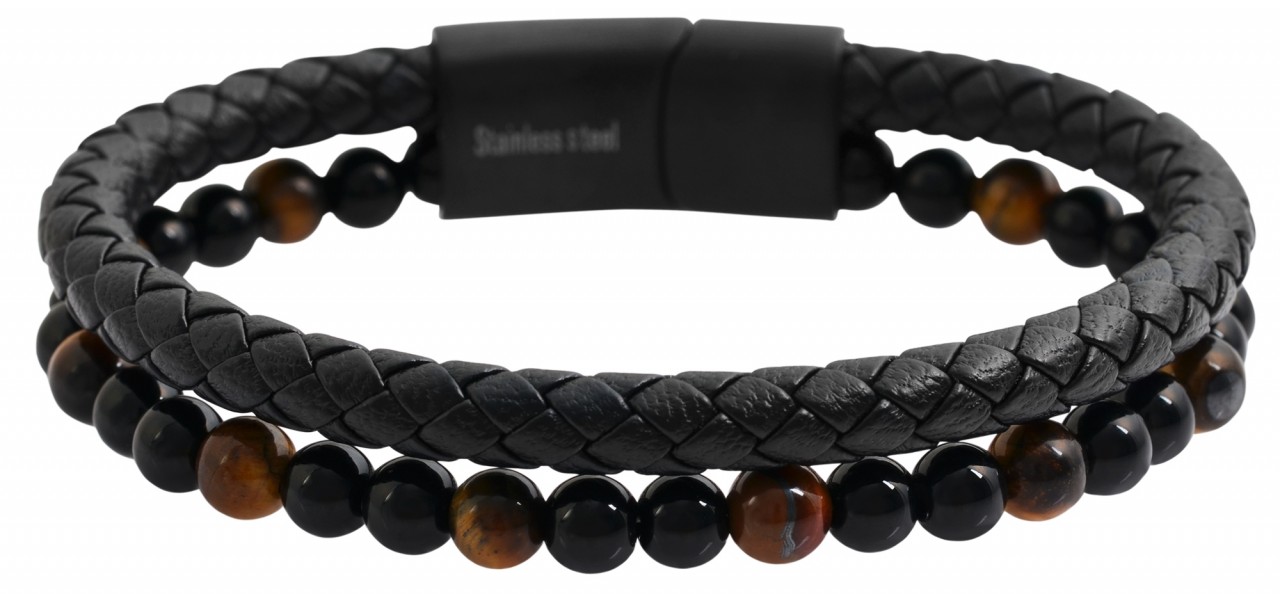 A pulseira da marca Praktik é composta por um cordão trançado preto feito de couro genuíno e uma fileira de pedras naturais. 31 contas são unidas por uma faixa de náilon transparente. Como as contas são um produto natural, cada bola é única e, portanto, possui efeitos de cores diferentes. Com um prático fecho magnético, a pulseira pode ser aberta e fechada com facilidade. O fecho fosco é feito de aço inoxidável e com acabamento em revestimento iônico de alta qualidade. A pulseira está disponível em diferentes comprimentos. As contas e a pulseira de couro têm 6 mm de espessura.