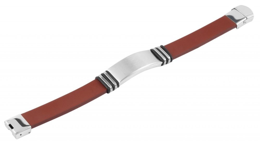 A pulseira de couro genuíno da marca Praktik é feita de uma pulseira de couro de 1,6 cm de largura, decorada com um elemento simples de aço inoxidável prateado no meio. Existem 2 ilhós estreitos de aço inoxidável presos à pulseira à esquerda e à direita da placa de gravação. O elemento de aço inoxidável é ideal para todos os tipos de gravuras. O comprimento total da pulseira é de 21 cm e 0,6 cm de espessura. Pode ser aberto e fechado com fecho de gancho prateado, também feito de aço inoxidável. Uma pulseira de joalheria simples que é um ótimo presente personalizado.