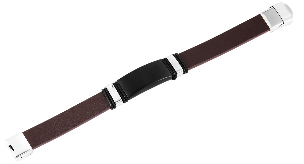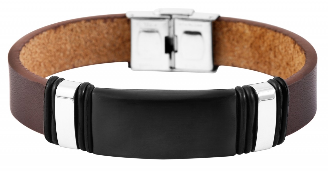 A pulseira de couro genuíno da marca Praktik é feita de uma pulseira de couro de 1,6 cm de largura, decorada com um elemento simples de aço inoxidável preto no meio. À esquerda e à direita da placa de gravação há estreitos ilhós de aço inoxidável prateados presos à pulseira. O elemento de aço inoxidável é adequado para todos os tipos de gravuras. O comprimento total da pulseira é de 21 cm e 9 mm de espessura. Pode ser aberto e fechado com fecho de gancho prateado, também feito de aço inoxidável. Uma pulseira de joalheria simples que é um ótimo presente personalizado.