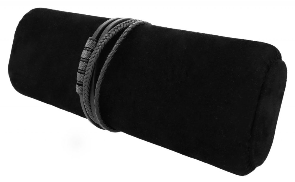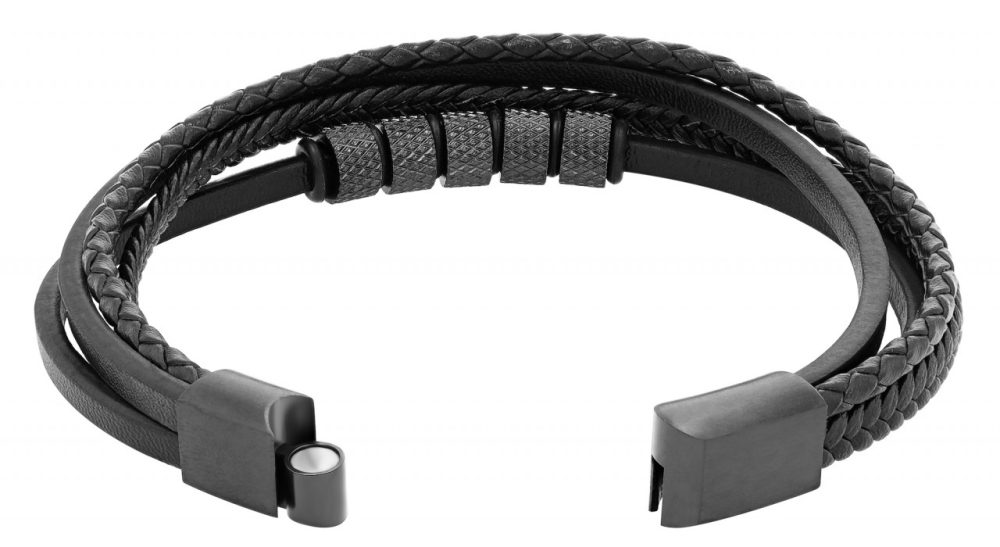 A pulseira preta da marca Praktik é feita de couro verdadeiro e tem 21,5 cm de comprimento. A pulseira de quatro fileiras consiste em duas tiras de couro com 4 mm de largura, uma tira trançada de 5 mm de largura e um cordão trançado de 3 mm de largura. Existem 5 elementos de aço inoxidável com revestimento IP preto em uma pulseira, que completam o design. A pulseira ganha um visual especial com a combinação de diferentes materiais. A pulseira é adequada para pulsos femininos e masculinos. Com este produto você obtém o acessório perfeito para presentear seus entes queridos com uma joia original ou para se presentear.
