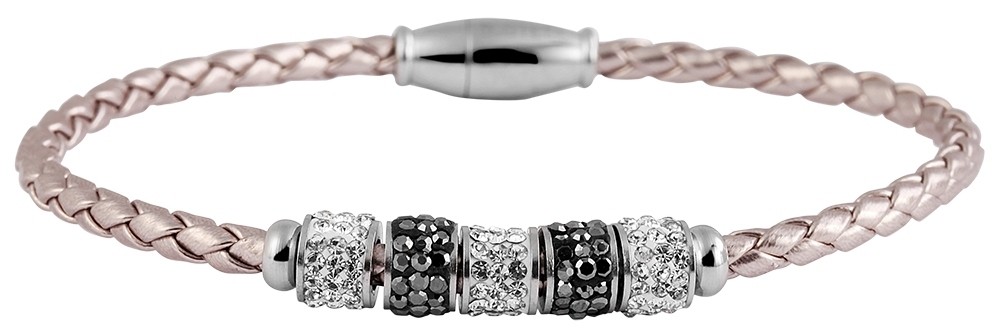 A pulseira de couro genuíno da marca Praktik consiste em uma pulseira de couro genuíno trançado decorada com cinco elementos redondos de aço inoxidável. Os elementos de aço são decorados com pedras simil brancas e/ou pretas ao redor. A pulseira feminina da moda pode ser aberta e fechada com um prático fecho magnético de aço inoxidável. As dimensões resultam de um comprimento total de 19 cm e uma espessura de 6 mm. A pulseira de joias é um lindo acessório para qualquer ocasião e é um bom presente.