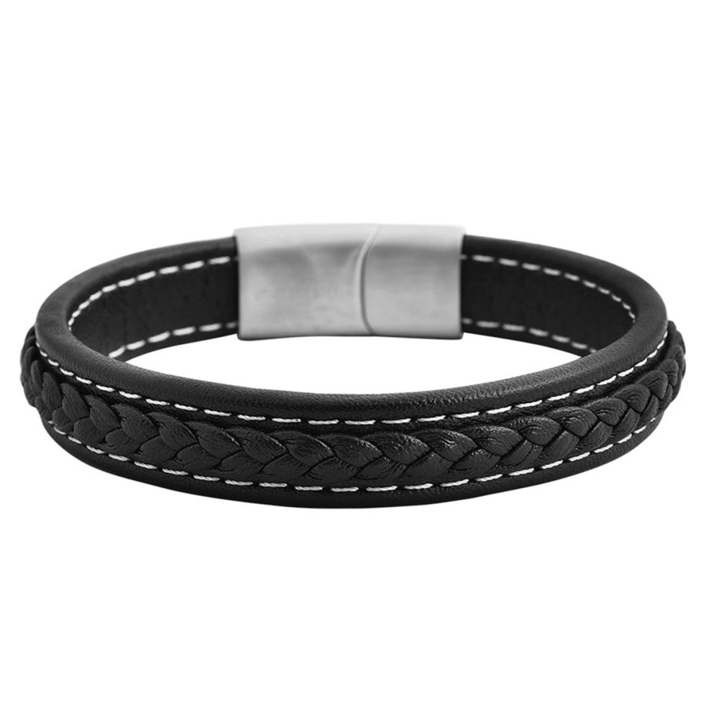 A pulseira de couro genuíno da Akzent é feita de uma pulseira de couro de 1,2 cm de largura. Outra pulseira de couro trançado é anexada a isso. Além disso, a faixa é destacada na parte externa com duas costuras brancas. A pulseira de joalheria moderna pode ser aberta e fechada com um fecho magnético prateado. As dimensões resultam de um comprimento total de 22 cm, uma largura de 1,2 cm e uma espessura de 0,6 cm. A pulseira é uma ótima companheira para o dia a dia e pode ser combinada com qualquer look.