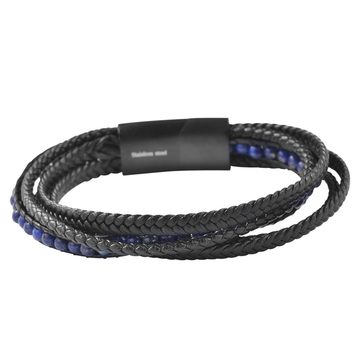 A pulseira preta da Akzent foi feita de couro genuíno e pedras naturais azuis e está disponível nos comprimentos 21 cm