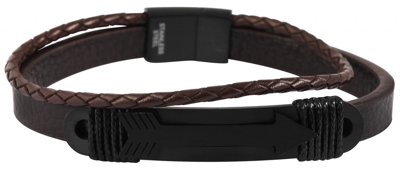 A pulseira de couro genuíno da marca Praktik é feita de uma pulseira de couro plana de 1 cm de largura e uma pulseira de couro trançado de 3 mm de largura. Um elemento de aço inoxidável preto em forma de seta está preso às tiras de couro mais largas. A moderna pulseira de joias pode ser aberta e fechada com um fecho magnético de aço inoxidável preto. As dimensões resultam de um comprimento total de 20 cm, largura de 1,3 cm e espessura de 3 mm. A pulseira pode ser combinada com qualquer roupa e é um ótimo presente.