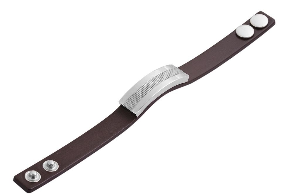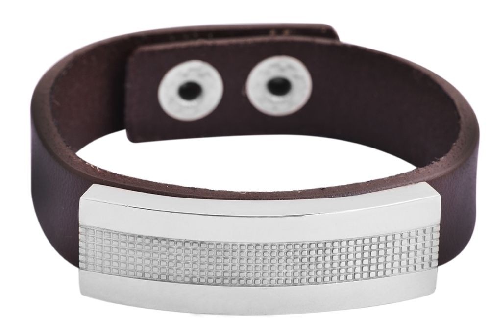 A pulseira de couro genuíno da marca Praktik é feita de uma pulseira de couro de 1,5 cm de largura, decorada com um elemento de aço inoxidável prateado no meio. Esta é decorada longitudinalmente com uma tira de vários pequenos quadrados fresados, que dão à joia um aspecto especial. O comprimento total da pulseira é de 22 cm. Pode ser aberto e fechado com dois fechos de pressão prateados, que também podem ser usados para variar a largura da pulseira. Uma joia simples que combina bem com qualquer estilo de roupa.