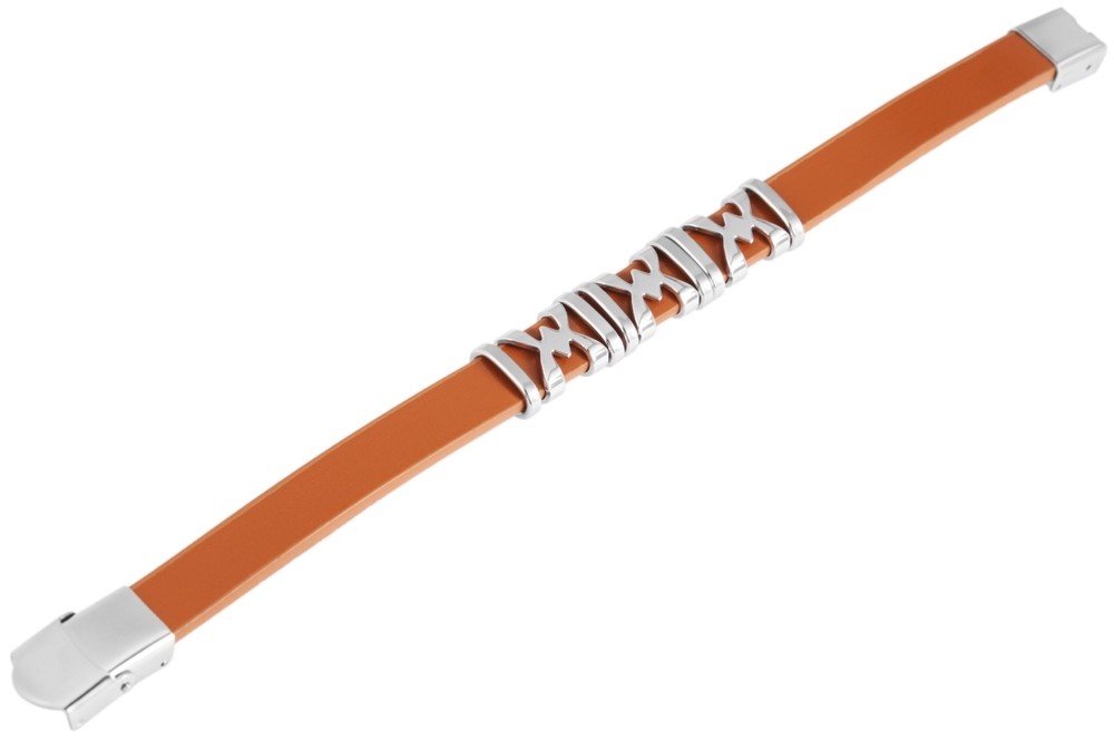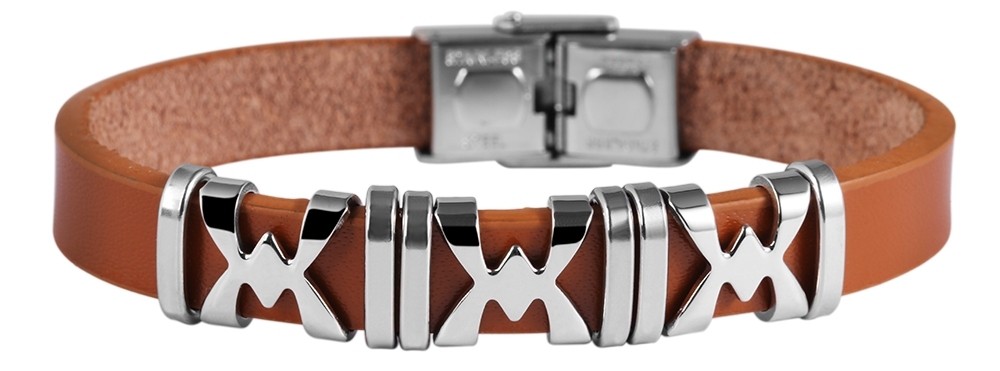A pulseira de couro genuíno da marca Praktik é feita de uma pulseira de couro genuíno com 1,3 cm de largura. Também é decorado com três elementos idênticos de aço inoxidável prateado que formam um X. Pode ser aberto e fechado com fecho de gancho prateado, também feito de aço inoxidável. O comprimento total é de 22 cm, a espessura é de 7 mm.