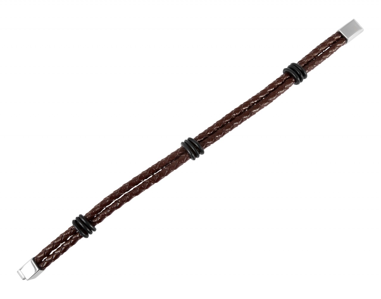 A pulseira marrom escuro da marca Praktik foi feita com duas tiras de couro genuíno. É fechado com um prático fecho magnético de aço inoxidável. A pulseira também é decorada com nove anéis de borracha preta, que também garantem que as duas tiras fiquem unidas. O comprimento total é de 21 cm, a largura é de 10 mm e a espessura do material é de 4 mm. Resumindo, esta pulseira de couro é uma companheira durável e confiável, que também é ideal como presente. O fecho polido pode ser fornecido com delicadas gravuras mediante solicitação, tornando esta pulseira um ótimo acessório personalizado.