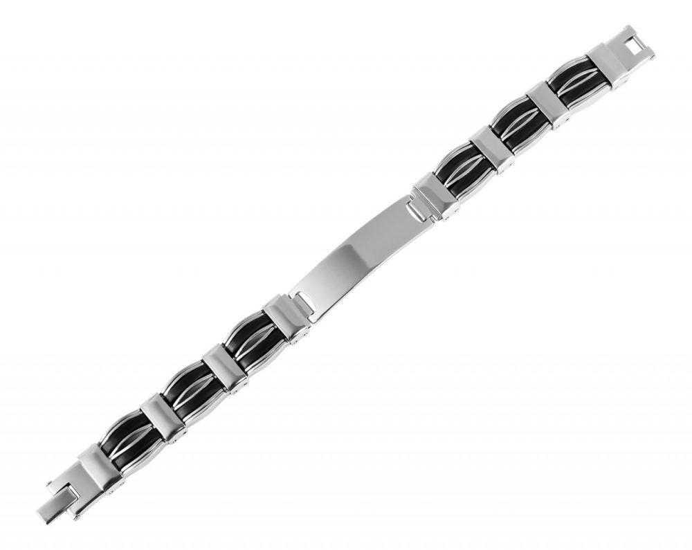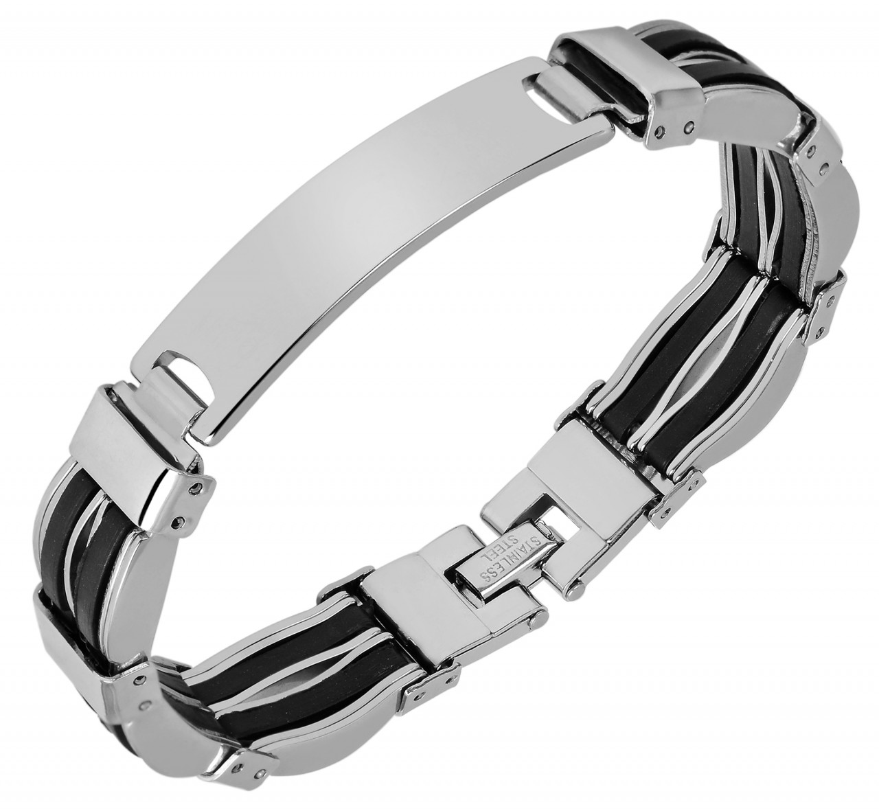 A pulseira maciça gravada da marca Praktik é feita de aço inoxidável e pode ser desenhada individualmente com gravuras pessoais graças à placa de identificação, tornando-a uma joia personalizada ideal para presente. A pulseira consiste em fileiras duplas de elementos de aço inoxidável prateados com elementos de borracha preta. Tem comprimento de 21,5 cm, largura de 11 mm e espessura de material de 6 mm. A pulseira gravada pode ser fechada com um fecho de gancho, que também é feito de aço inoxidável e garante uma fixação segura no pulso. A placa de gravação altamente polida mede 45 mm de comprimento, 12 mm de largura e 2 mm de espessura, proporcionando espaço suficiente para a sua própria mensagem.