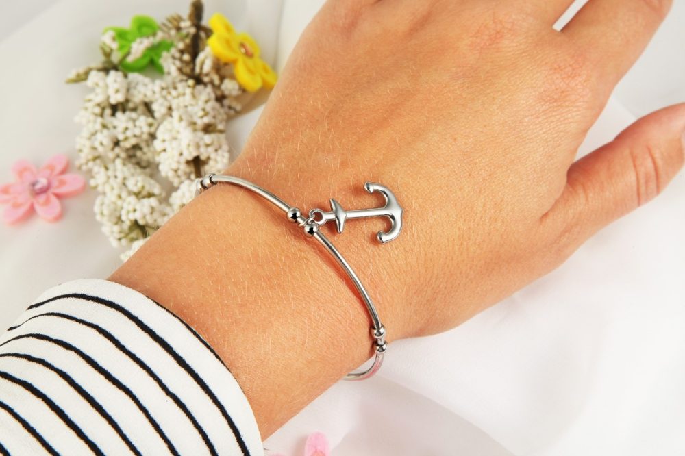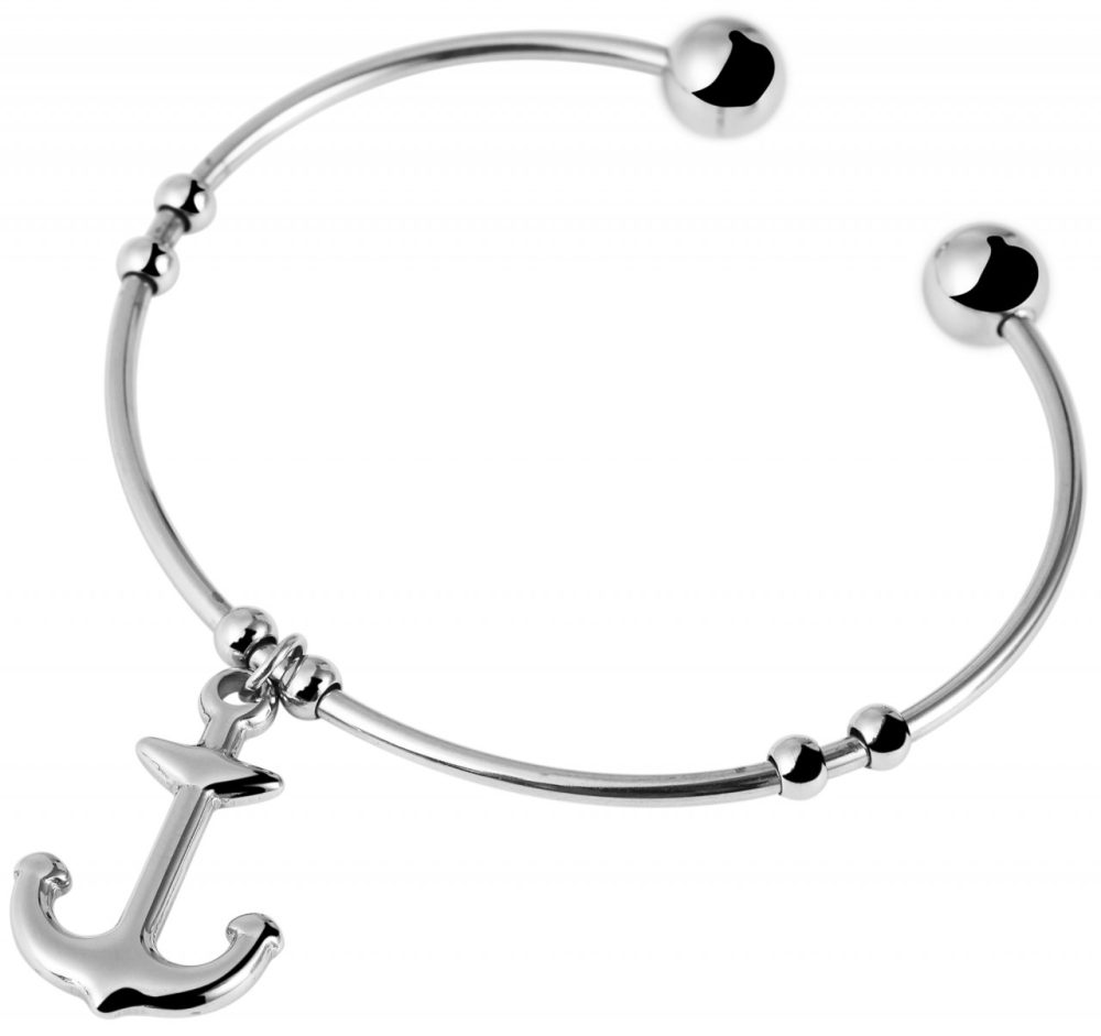 A pulseira prateada da marca Akzent é feita de aço inoxidável. Existem 6 bolinhas presas à pulseira para decoração. Há um pingente de âncora no meio de duas bolas decorativas. A pulseira tem uma abertura que a torna mais flexível para colocar. Em ambas as extremidades da abertura existe uma bola decorativa maior, também feita de aço inoxidável.