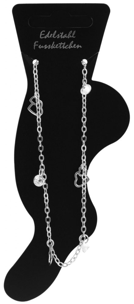 A tornozeleira prateada da marca Praktik é feita de aço inoxidável. A corrente no padrão âncora tem 25 cm de comprimento e espessura de corrente de 1 mm. Além disso, uma corrente de extensão de 5 cm de comprimento é presa a uma extremidade da joia do pé. Isto permite variar o comprimento em até 5 cm e adaptar a corrente a qualquer tornozelo. A divertida tornozeleira pode ser aberta e fechada com um mosquetão, que também é feito de aço inoxidável. A tornozeleira é decorada com diferentes pingentes em intervalos regulares. As modernas joias para os pés combinam perfeitamente com tênis ou sandálias e completam qualquer look.