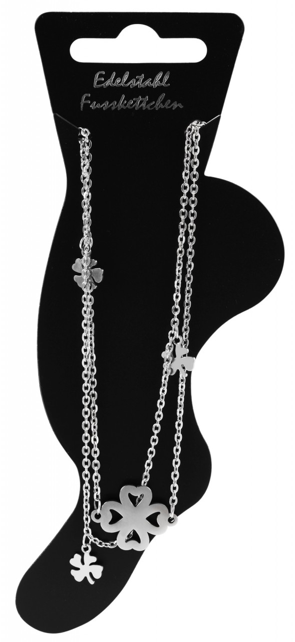 A tornozeleira da marca Praktik é feita de aço inoxidável e composta por duas correntes de âncora. A corrente com padrão de âncora está disponível em diversas cores. Tem 26 cm de comprimento e uma espessura de corrente de 1 mm. Além disso, uma corrente de extensão de 5 cm de comprimento é presa a uma extremidade da joia do pé. Isto permite variar o comprimento em até 5 cm e adaptar a corrente a qualquer tornozelo. A divertida tornozeleira pode ser aberta e fechada com um mosquetão, que também é feito de aço inoxidável. A tornozeleira é decorada com pingentes de trevo em intervalos regulares. As modernas joias para os pés combinam perfeitamente com tênis ou sandálias e completam qualquer look.