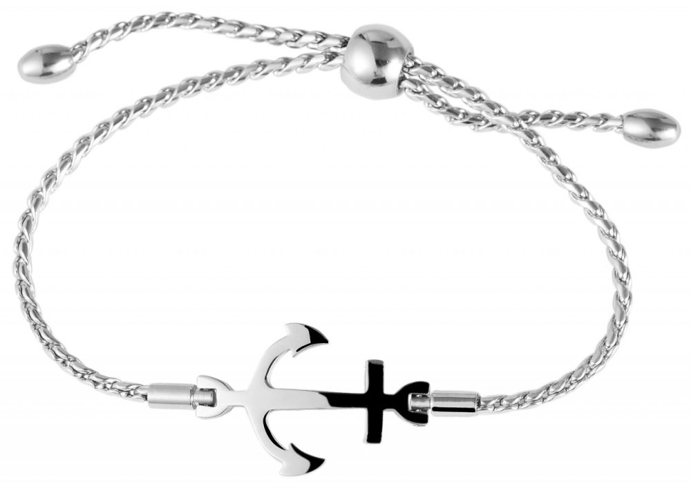 A pulseira de corrente da marca Praktik é feita de aço inoxidável. A textura é de aço inoxidável fosco e brilhante. Tem 22 cm de comprimento. A pulseira simples pode ser aberta e fechada com um fecho de puxar, também feito de aço inoxidável. O que chama a atenção é a âncora no meio da pulseira. O diâmetro da pulseira é de 80 mm. A largura é de 2 mm.