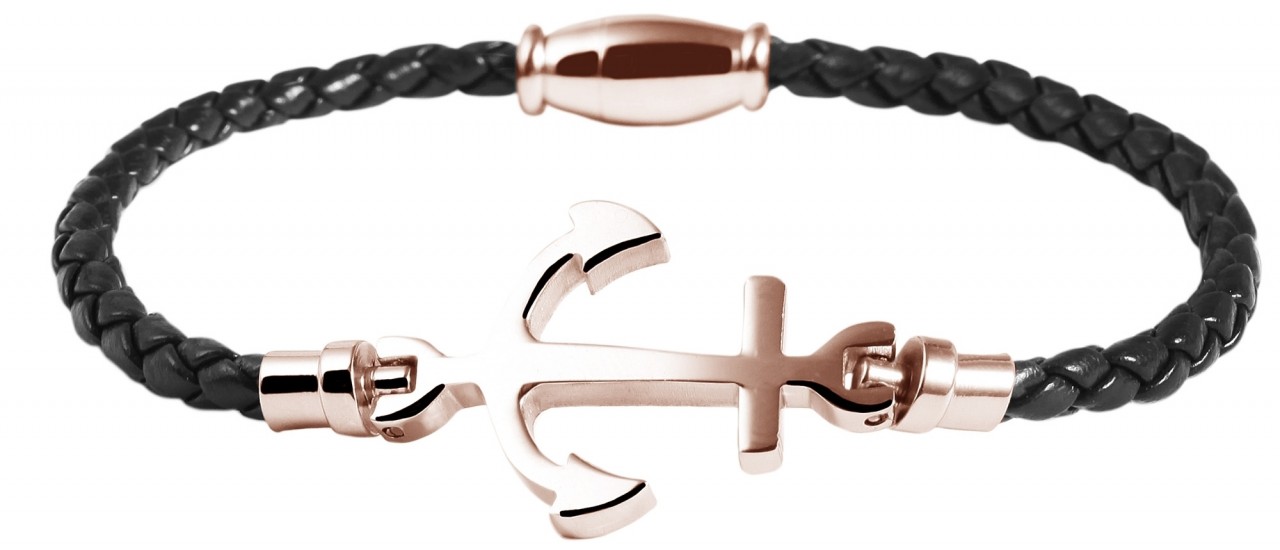 A pulseira de couro genuíno da marca Praktik foi feita a partir de uma pulseira de couro genuíno trançado. Um elemento de aço inoxidável em forma de âncora é fixado no meio. É polido e confere à pulseira um aspecto especial e marítimo. A moderna pulseira de joias pode ser aberta e fechada com um fecho magnético. O comprimento total da pulseira é de 18 cm, o elemento de aço inoxidável tem 1,8 cm de largura.