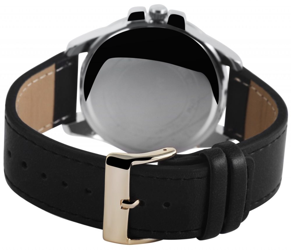 O relógio analógico masculino da marca Praktik possui um movimento de quartzo de alta qualidade. A pulseira em imitação de couro tem 22 mm de largura e abre com uma fivela. O comprimento total é de 25 cm. A caixa de metal com vidro mineral tem dimensão de 44 mm e altura de caixa de 11 mm. A tampa da caixa é feita de aço inoxidável. O relógio é testado com pressão de 3 ATM.