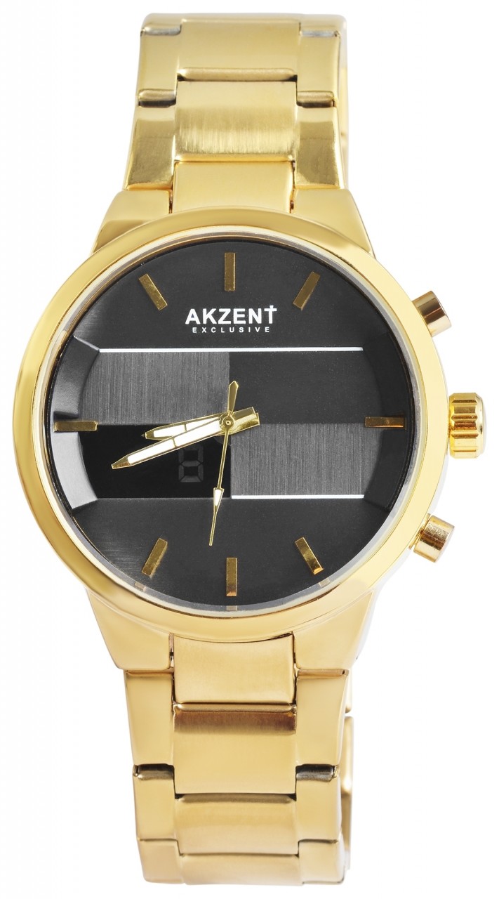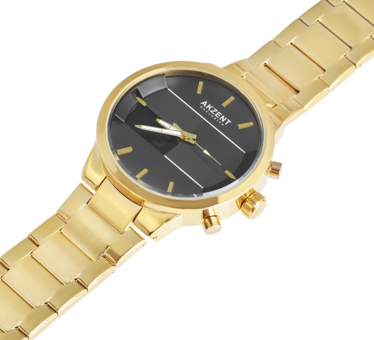 O relógio possui movimento de quartzo de alta qualidade e digital. A pulseira em metal tem 24 mm de largura. O comprimento total é de 23 cm. A caixa de metal com vidro mineral tem dimensão de 46 mm e altura de caixa de 16 mm. A tampa da caixa é feita de aço inoxidável. O acabamento em cristal no mostrador também é um destaque visual. O relógio é testado com pressão de 3 ATM.