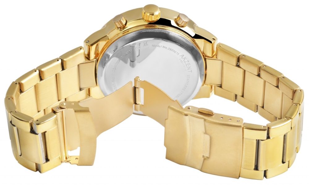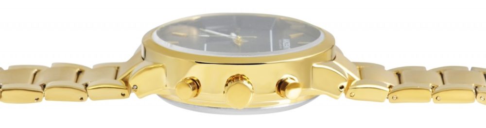 O relógio possui movimento de quartzo de alta qualidade e digital. A pulseira em metal tem 24 mm de largura. O comprimento total é de 23 cm. A caixa de metal com vidro mineral tem dimensão de 46 mm e altura de caixa de 16 mm. A tampa da caixa é feita de aço inoxidável. O acabamento em cristal no mostrador também é um destaque visual. O relógio é testado com pressão de 3 ATM.
