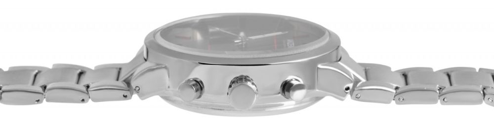 O relógio possui movimento de quartzo de alta qualidade e digital. A pulseira em metal tem 24mm de largura. O comprimento total é de 23 cm. A caixa de metal com vidro mineral tem dimensão de 46 mm e altura de caixa de 16 mm. A tampa da caixa é feita de aço inoxidável. O acabamento em cristal no mostrador também é um destaque visual. O relógio é testado com pressão de 3 ATM.