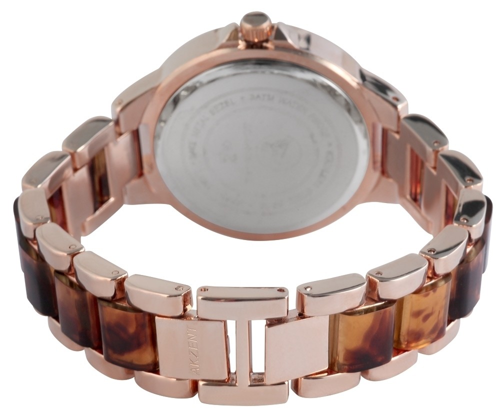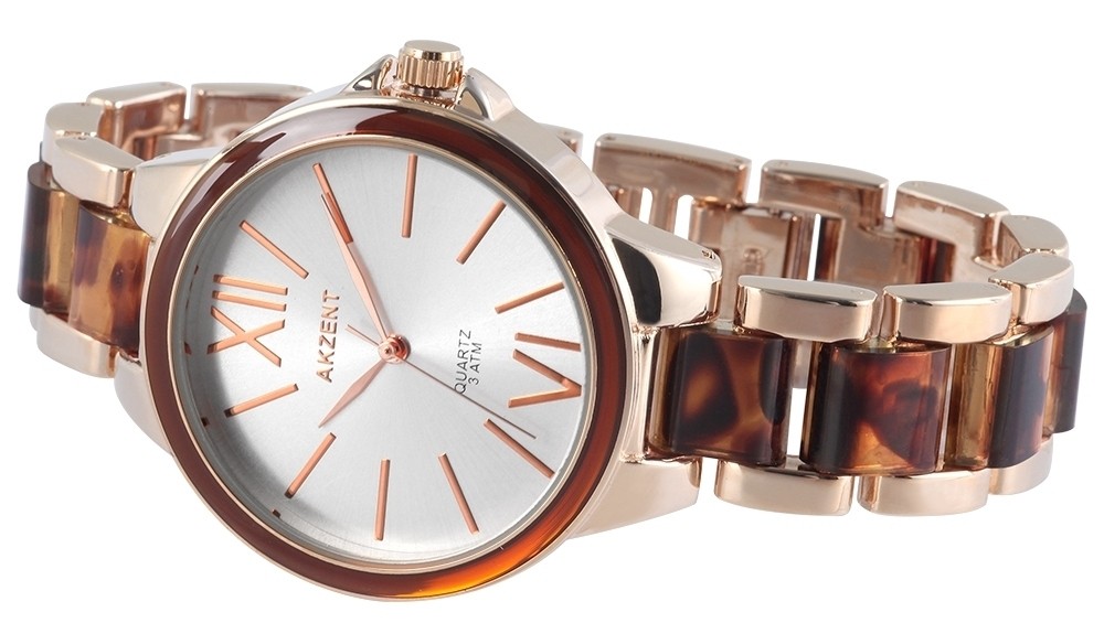O relógio analógico Akzent para senhora possui um movimento de quartzo de alta qualidade. A bracelete metálica tem 18 mm de largura e abre-se com um fecho de correr. O comprimento total é de 18 cm. A caixa metálica com vidro mineral mede 40 mm e tem 10 mm de altura. A tampa da caixa é feita de aço inoxidável. O relógio é testado contra pressão de 3 ATM.