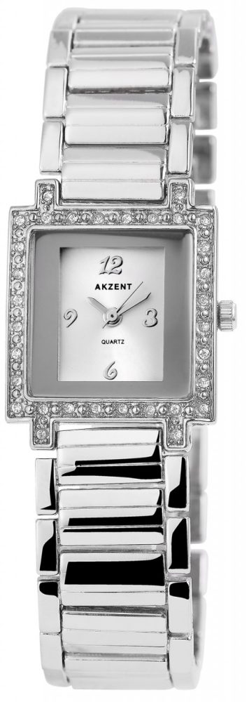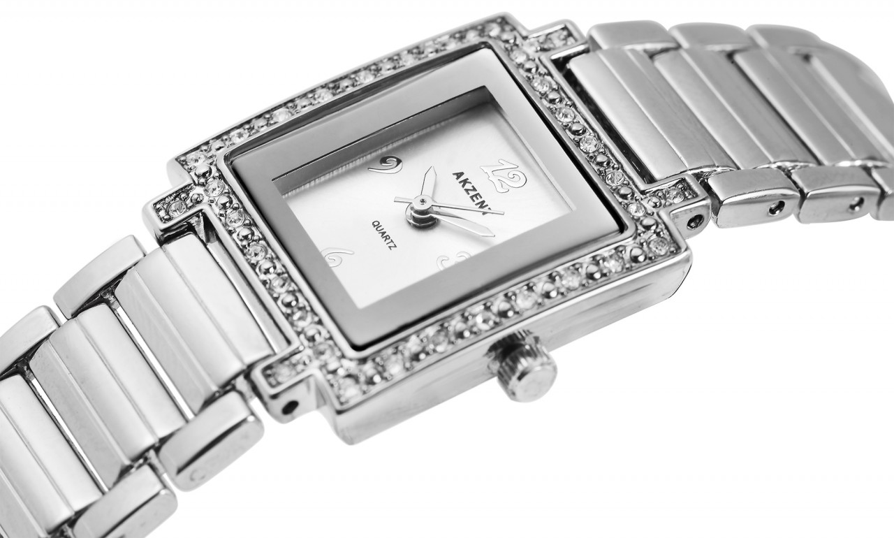 O relógio analógico Akzent para senhora possui um movimento de quartzo de alta qualidade. A bracelete metálica tem 17 mm de largura e um comprimento total de 20 cm. A caixa metálica com vidro mineral mede 23 x 24 mm e tem 8 mm de altura. A caixa é realçada por um friso de cristal. A tampa da caixa é feita de aço inoxidável. O relógio é testado à pressão até 3 ATM.