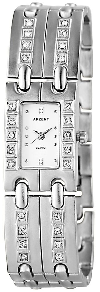 O relógio analógico Akzent para senhora possui um movimento de quartzo de alta qualidade. A bracelete metálica tem 19 mm de largura e abre-se com um fecho desdobrável. O comprimento total é de 19,5 cm. A caixa de metal com vidro mineral mede 19 x 29 mm e tem 8 mm de altura. A caixa é realçada por um friso de cristal. A tampa da caixa é feita de aço inoxidável. O relógio é testado a uma pressão de 3 ATM.