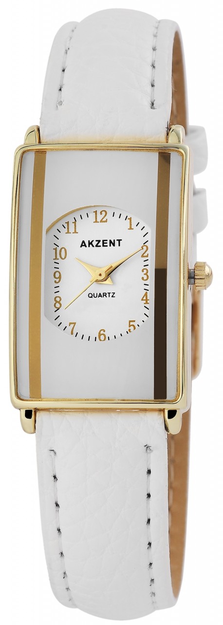 O relógio analógico Akzent para senhora possui um movimento de quartzo de alta qualidade. A bracelete em imitação de pele tem 16 mm de largura e abre-se com uma fivela de pino. O comprimento total é de 22 cm. A caixa metálica com vidro mineral mede 23 x 34 mm e tem 9 mm de altura. A tampa da caixa é feita de aço inoxidável. O relógio é testado a uma pressão de 3 ATM.