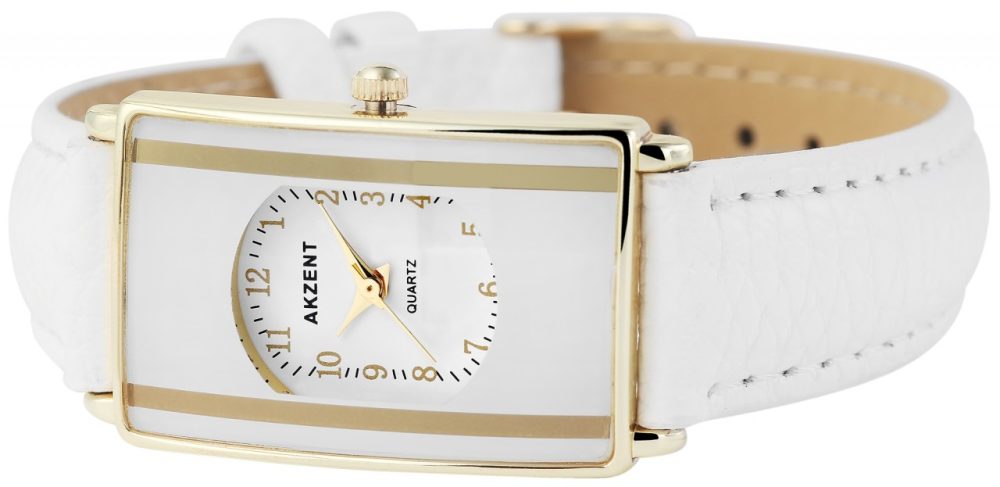 O relógio analógico Akzent para senhora possui um movimento de quartzo de alta qualidade. A bracelete em imitação de pele tem 16 mm de largura e abre-se com uma fivela de pino. O comprimento total é de 22 cm. A caixa metálica com vidro mineral mede 23 x 34 mm e tem 9 mm de altura. A tampa da caixa é feita de aço inoxidável. O relógio é testado a uma pressão de 3 ATM.