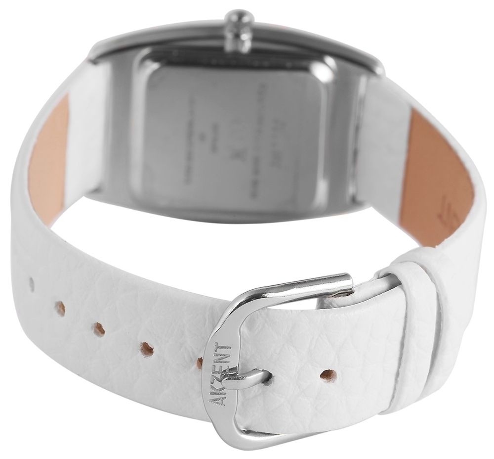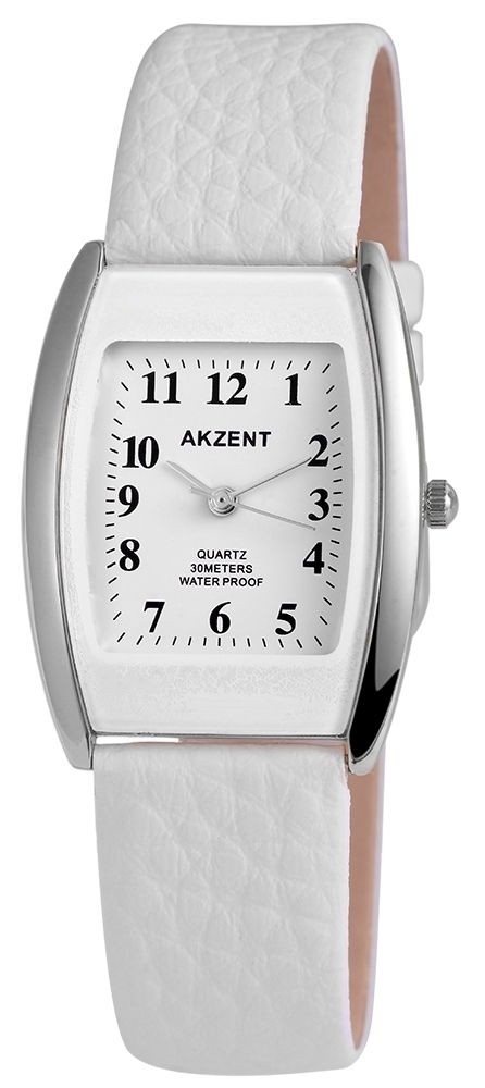 O relógio analógico Akzent para senhora possui um movimento de quartzo de alta qualidade. A designação do modelo é AK0401. A bracelete em imitação de pele tem 18 mm de largura e abre-se com uma fivela de pino. O comprimento total é de 22 cm. A caixa metálica com vidro mineral mede 29×39 mm e tem 8 mm de altura. A tampa da caixa é feita de aço inoxidável. O relógio é testado a uma pressão de 3 ATM.