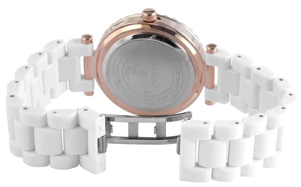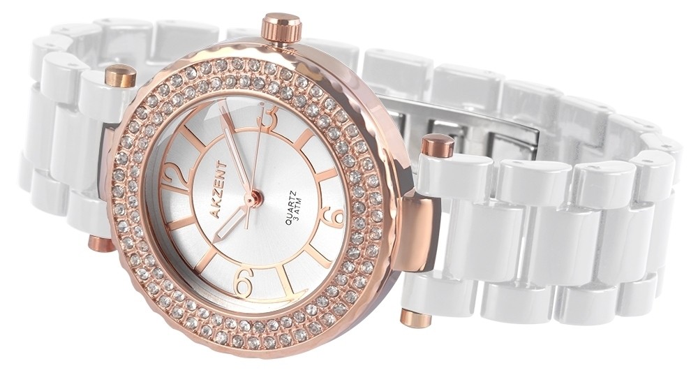 O relógio analógico Akzent para senhora tem um movimento de quartzo de alta qualidade. A bracelete de silicone tem 20 mm de largura e abre-se com um fecho desdobrável em aço inoxidável. O comprimento total é de 19 cm. A caixa metálica com vidro mineral mede 40 mm e tem 12 mm de altura. A caixa é realçada com um acabamento em cristal. A tampa da caixa é feita de aço inoxidável. O relógio é testado à pressão até 3 ATM.